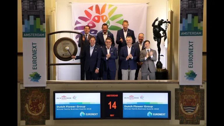 Marco van Zijverden, CEO Dutch Flower Group, viert met het luiden van de gong, samen met collega’s, het winnen van de Familiebedrijven Award 2018. Het familiebedrijf werd gekozen uit een selecte groep van vijf genomineerde ondernemingen.