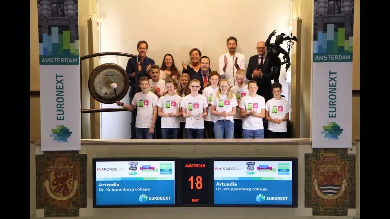 Dr.-Knippenberg college uit Helmond viert het winnen van de kunst- en techniekwedstrijd Artcadia 2018 met een gongslag. De wedstrijd wordt jaarlijks georganiseerd door het advies- en ingenieursorganisatie Arcadis (ticker symbol: ARCAD), de stichting KNHM en Canon Business Services.