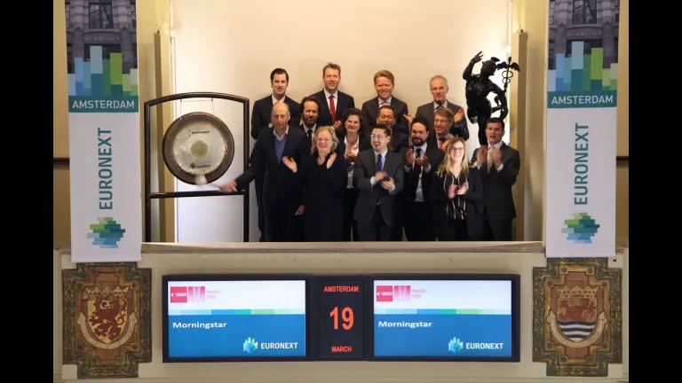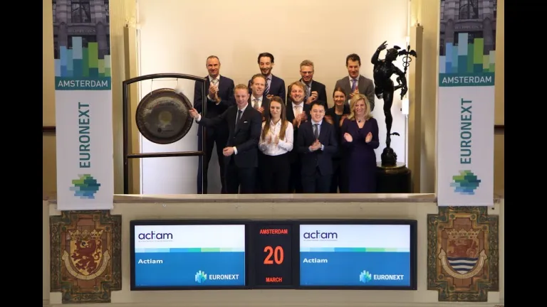 CEO van ACTIAM Hans van Houwelingen luidt de gong om de handelsdag op Euronext te openen.