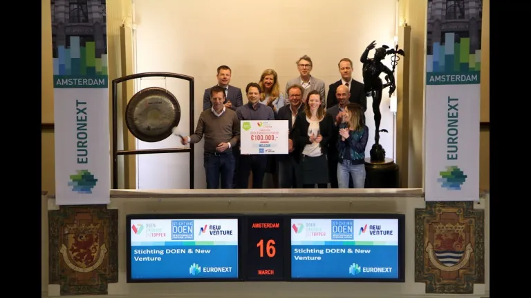 Met een “Mogen alle aandelen voortaan alleen nog maar groen kleuren” opent de winnaar van de DOEN Energie[s]topper vandaag de handel in Amsterdamse. De winnaar ontvangt een cheque ter waarde van 100.000 euro van stichting DOEN om hun product of dienst op de markt te kunnen brengen.