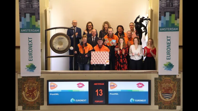 Postbezorgers van PostNL (ticker symbol: PNL) bezoeken de Amsterdamse beurs en openen de handel ter gelegenheid van Valentijnsdag.