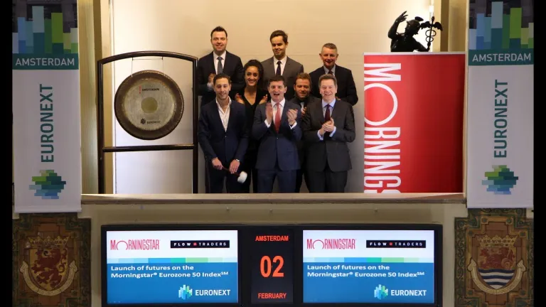 Flow Traders luidt samen met Morningstar en Euronext de gong op de Amsterdamse beurs van Euronext voor de lancering van futures op de Morningstar® Eurozone 50 IndexSM op de derivatenmarkt van Euronext Amsterdam. Yannick Ignoul van Flow Traders, luidt de gong en opent de handelsdag.