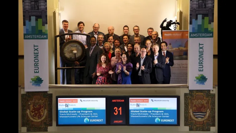 Travis McCready, President & CEO van het Massachusetts Life Sciences Center, luidt de gong en opent de handelsdag op de beurs in Amsterdam voor het Global Scale-up Program.