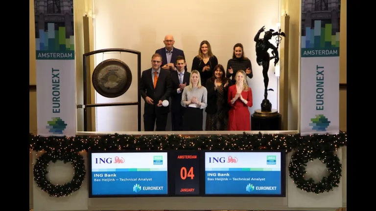 Al meer dan tien jaar beloont Gouden Stier brokers met prijzen. Eind 2017 is ING de trotse prijswinnaar in twee categorieën: ‘Beste beleggingsinstelling’ en ‘Beste technisch Analist’. Bas Heijink luidt de gong en opent hiermee de handelsdag op de Amsterdamse beurs.