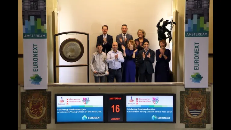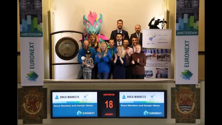 Roca Markets luidt de gong samen met Kanjer Wens en opent hiermee de handelsdag op de Amsterdamse beurs. Als onderdeel van hun beleid om een percentage van hun winst aan het goede doel te doneren, heeft Roca Markets zowel vorig jaar als dit jaar voor Kanjer Wens gekozen.