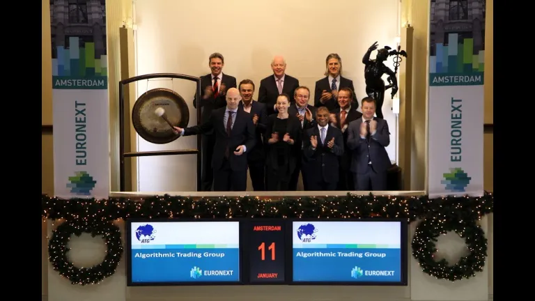 Chief Compliance Officer en mede-eigenaar van Algorithmic Trading Group (ATG) , Jochem van Steijn, geeft met een slag op de gong het startschot voor de beurshandel. ATG viert het verkrijgen van haar handels licentie onder MiFID II.