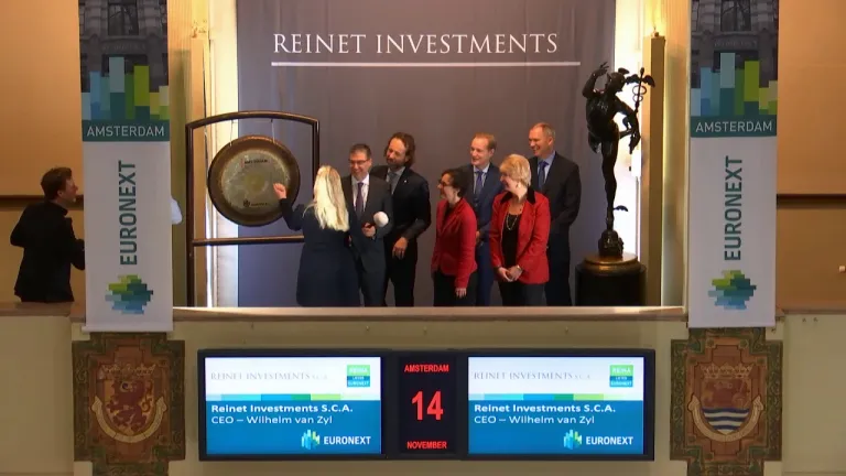 Euronext Amsterdam verwelkomt Reinet Investments S.C.A. (ticker symbol: REINA), een investeringsvehikel gevestigd in Luxemburg. Wilhelm van Zyl, CEO Reinet Investments, viert de notering met een slag op de gong.