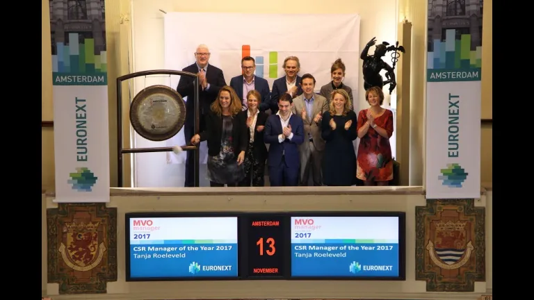Tanja Roeleveld, Programma Manager Duurzaam & Betrokken Ondernemen bij Landal GreenParks, is uitgeroepen tot MVO Manager van het Jaar 2017 en luidt hiervoor de beursgong van Euronext.