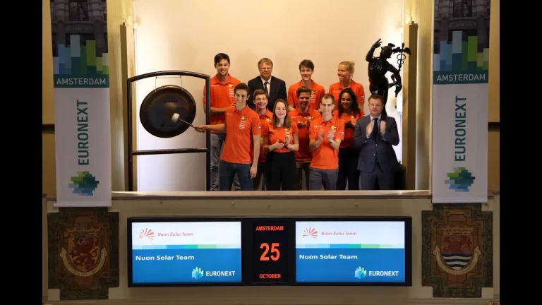 Het Nuon Solar Team opent de beurshandel bij Euronext Amsterdam. Het Delftse studententeam doet dit naar aanleiding van het winnen van het officieuze wereldkampioenschap voor zonneauto’s: de Bridgestone World Solar Challenge in Australië. Met de gongslag luidt het Nuon Solar Team tevens het nieuwe jaar in waarin toegewerkt wordt naar een andere race. Meer dan ooit zal de nadruk dit jaar liggen op hightech innovaties.