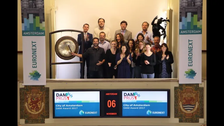 De Amsterdamse beurs van Euronext wordt geopend door de genomineerden en organisatie van de DAM Prijs 2017.