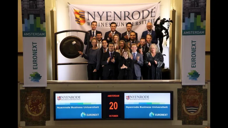 Studenten van Nyenrode Business Universiteit openen de Amsterdamse beurs voor de uitbreiding van de universiteit naar Amsterdam.