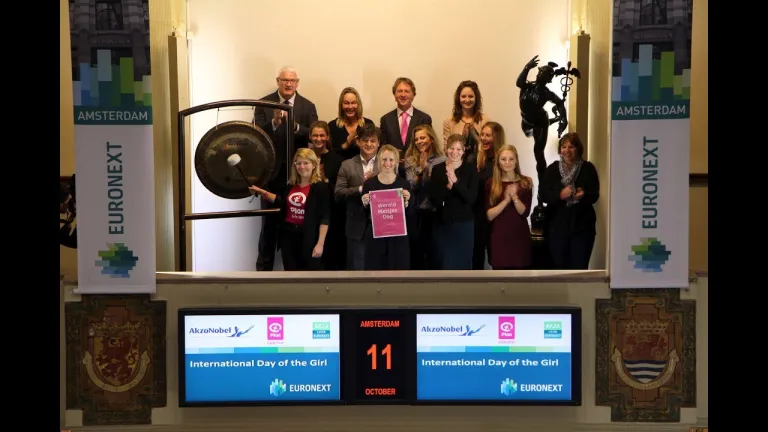 AkzoNobel en Plan Nederland openen vanochtend de beursgang om aandacht te vragen voor Wereldmeisjesdag. De 22-jarige Dunya Veenhof luidt de gong.