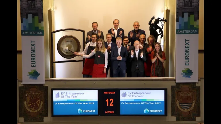Michiel Muller, door EY uitverkozen tot Emerging Entrepreneur Of The Year 2017, slaat samen met zijn collega’s de gong en opent hiermee de beurshandel aan het Beursplein.