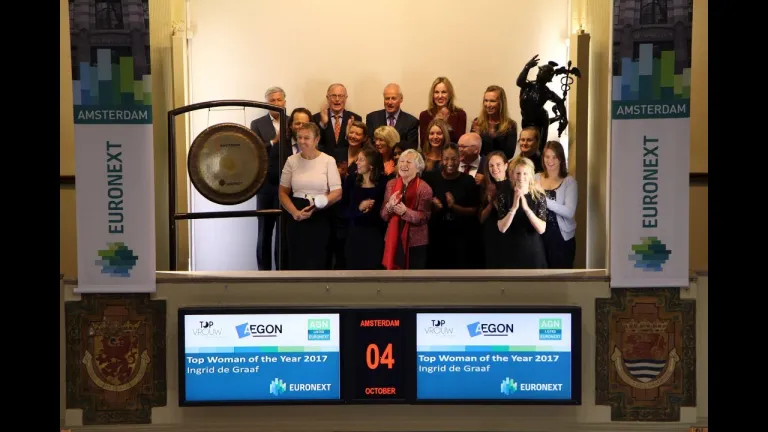Ingrid de Graaf, directielid bij Aegon (ticker symbol: AGN), is benoemd tot Topvrouw van het jaar 2017 en viert dit met een slag op de gong.