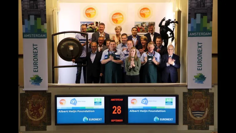 De Amsterdamse beurs van Euronext wordt geopend door de AH Foundation die deze maand 10 jaar bestaat. Voorzitter Cees van Vliet, directeur winkels en logistiek van Albert Heijn, slaat samen met collega’s en medewerkers uit de winkel de gong.