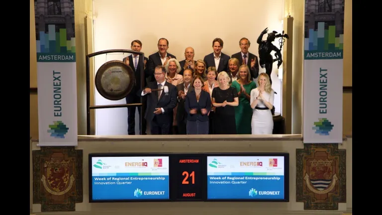 Han Weber, gedeputeerde van de provincie Zuid-Holland, opent de Amsterdamse beurs en luidt hiermee de gong voor ondernemers die op zoek zijn naar financiering voor de commercialisatie van hun energie-innovatie. Specifiek voor deze doelgroep start op 1 september ENERGIIQ, het energie-innovatiefonds van de provincie Zuid-Holland. ENERGIIQ wordt uitgevoerd door InnovationQuarter.