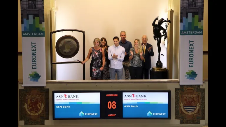 ASN Bank bezoekt de Amsterdamse beurs van Euronext en opent de handel met een slag op de gong. Dit doen zij naar aanleiding van het verkrijgen van wederom vijf sterren voor de voorwaarden van hun ASN Bank spaarrekeningen.