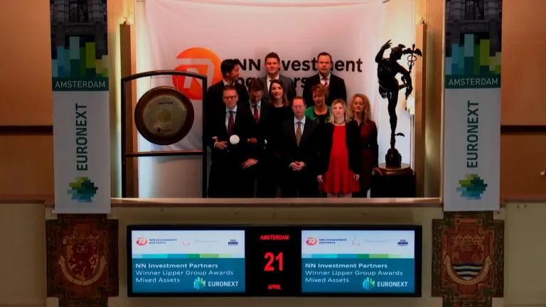 NN IP bezoekt de Amsterdamse beurs nadat zij door financieel onderzoeker Lipper bekroond zijn voor twee defensieve fondsen uit het mixfondsenaanbod. Ewout van Schaick, Hoofd Multi-Asset Portfolio’s bij NN IP opent de handel met een slag op de gong.