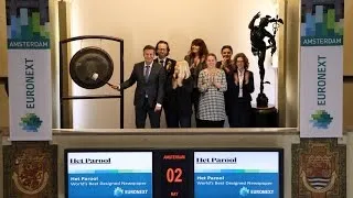 Het Parool is onlangs verkozen tot 'World's Best Designed Newspaper'. Ronald Ockhuysen, hoofdredacteur van de krant, luidt in het bijzijn van collega’s de gong op de Amsterdamse beurs.