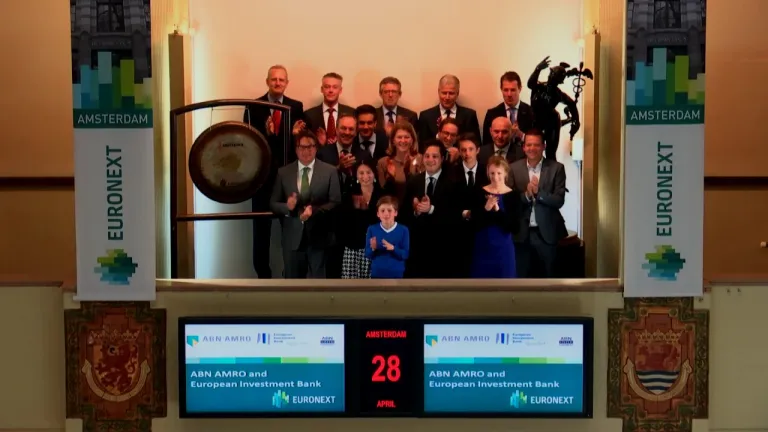 De Europese Investeringsbank (EIB) en ABN AMRO (ticker symbol: ABN) hebben een overeenkomst getekend om investeringen in Europese groene scheepvaart te ondersteunen. Het gaat om de eerste overeenkomst op het gebied van investeringen in groene scheepvaart met een financiële instelling in Nederland. Zij bezoeken de Amsterdamse beurs van Euronext en openen de handel met een slag op de gong.