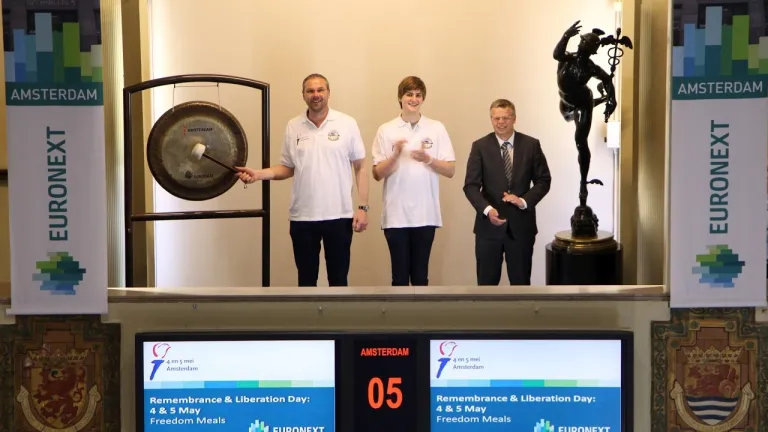Het Amsterdams Comité 4 en 5 mei bezoekt de Amsterdamse beurs van Euronext en opent de handel met een slag op de gong.