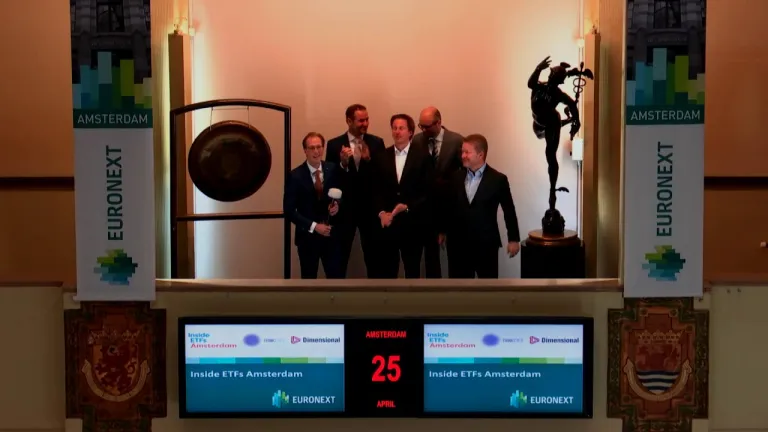 Sponsoren van het Inside ETFs Amsterdam event, Dimensional, en Think ETF’s, bezoeken de Amsterdamse beurs en openen de handel met een slag op de gong.
