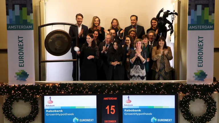 Rabobank komt als eerste bank met GroenHypotheek en bezoekt ter ere hiervan de Amsterdamse beurs. Elze Vonk, Hoofd Financieren en Verzekeren Particulieren bij de Rabobank, luidt de gong.
