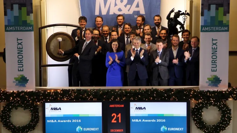 De M&A winnaars luiden de gong en openen de handelsdag. De M&A awards uitgereikt aan de top op het gebied van M&A, corporate finance en private equity. De winnaar in de categorie Best Equity Capital Markets Banker luid de gong. Dit jaar viel de award in handen van Chris van Schuppen, Senior Managing Director van ABN AMRO.