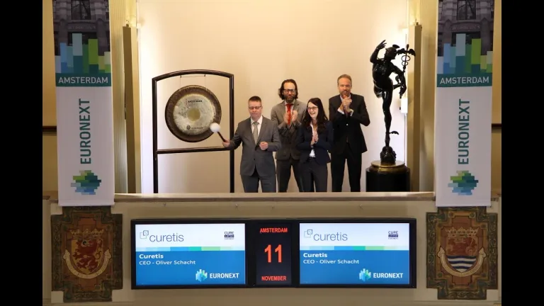 Curetis (ticker symbol: CURE) viert haar eenjarige notering aan Euronext met een slag op de gong. Oliver Schacht, CEO Curetis, bezoekt Beursplein 5 en luidt de gong.