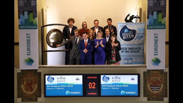 De Amsterdamse beurs van Euronext wordt geopend door de winnaars van de AH Product Pitch 2016, samen met jurylid Marit van Egmond, directeur Merchandising & Sourcing.