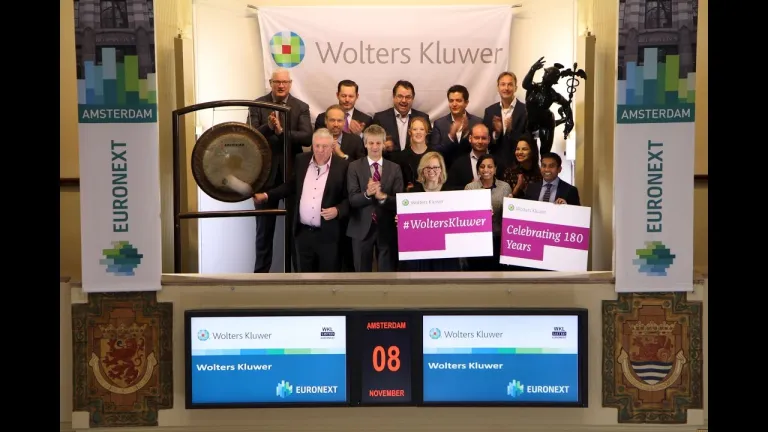Dit jaar viert Wolters Kluwer (ticker symbol: WKL) het 180-jarig bestaan met een bezoek aan Beursplein 5. Frans Klaassen, Managing Director Wolters Kluwer Legal & Regulatory Nederland en Andre Kwakernaat, Head of Tax & Accounting Europe Business Innovation, luiden de gong van Euronext Amsterdam om de 180-jarige rijke geschiedenis van Wolters Kluwer te vieren.