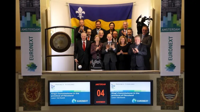 De Commissaris van de Koning van de provincie Flevoland, Leen Verbeek, opent de beursdag van de Amsterdamse beurs. Dit doet hij met een gongslag in het bijzijn van een aantal veelbelovende Flevolandse ondernemingen. De ceremonie staat deze ochtend dan ook in het teken van het Flevolandse ondernemerschap.