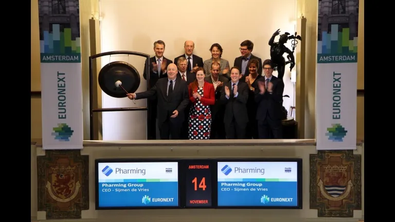 Sijmen de Vries, CEO van het aan Euronext genoteerde Pharming (ticker symbol: PHARM) luidt de gong op de Amsterdamse beurs. Pharming heeft in de afgelopen maanden belangrijke ontwikkelingen doorgemaakt. De onderneming wordt nu de eerste en enige Nederlandse biotech die de verkoop en marketing van een zelf ontwikkeld product, RUCONEST®, in Noord-Amerika ter hand gaat nemen.