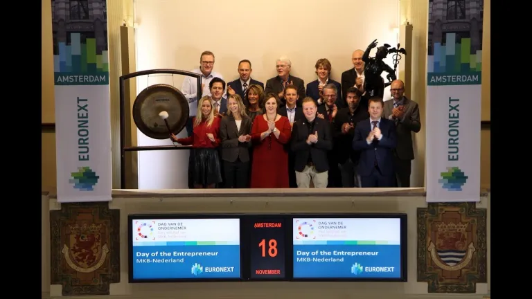 Fabian Nagtzaam, regiodirecteur MKB Noord-Holland: “Een prachtige gelegenheid om vandaag de vier eeuwen oude beurs te openen doormiddel van het slaan van de beursgong door 2 ondernemers en ambassadeurs van de Dag van de Ondernemer; Steffie Burgemeestre en Thijs van Koesveld van horecaketen Bulls & Dogs tezamen met 13 andere betrokken ondernemers. Het is de start van een traditie om het ondernemerschap te vieren en ondernemers te bedanken. Er zijn in Nederland ruim 1,5 miljoen ondernemers die met hun bedrijf van enorme toegevoegde waarde zijn voor ons land. Ondernemers creëren groei, banen en welvaart.”