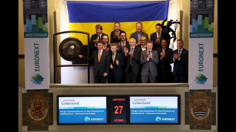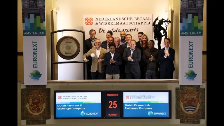 De Nederlandsche Betaal en Wisselmaatschappij opent de handel op de Amsterdamse beurs. Rolf van Woerkom, Head of Marketing & Sales luidt de gong in het bijzijn van zijn collega’s.