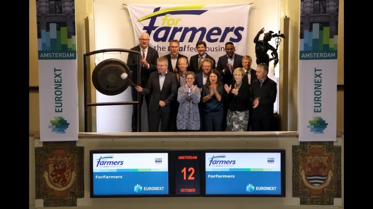 Jan Potijk, directeur ForFarmers Nederland (ticker symbol: FFARM) , luidt de gong voor de onlangs afgeronde overname van Vleuten-Steijn. Vleuten-Steijn is een veevoederonderneming gericht op de varkenssector, voornamelijk in Zuidoost-Nederland. ForFarmers, marktleider in de veevoersector, zet zich in voor “For the Future of Farming”. Door intensief met klanten samen te werken biedt ForFarmers hen een beter rendement, een gezondere veestapel en een hogere efficiëntie.