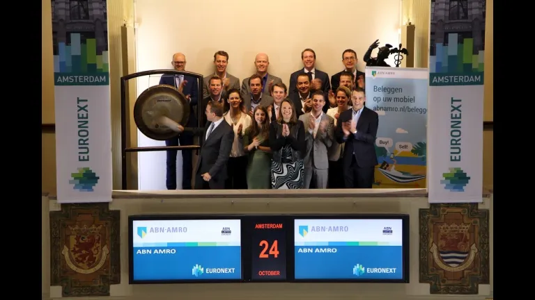 Met het luiden van de gong lanceert Job Mantz, Senior Digital Product Manager ABN AMRO, samen met zijn collega’s de vernieuwde Beleggen-website van ABN AMRO.