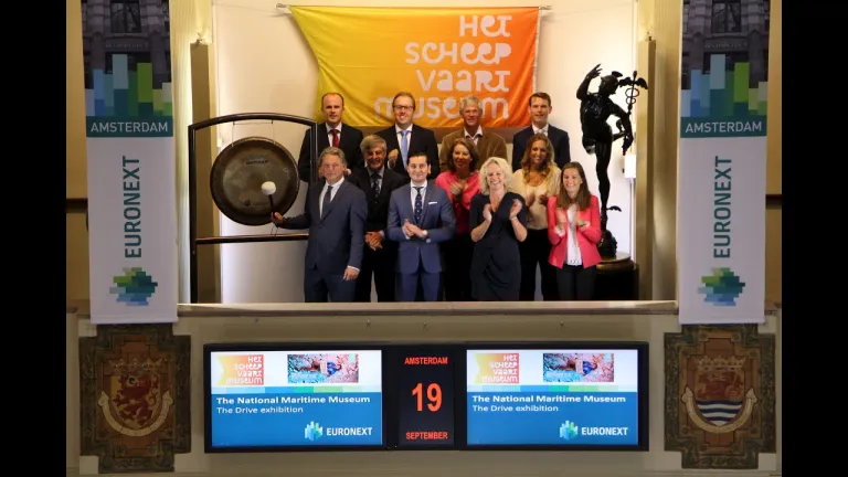 Algemeen directeur van Het Scheepvaartmuseum, Michael Huijser, opent de Amsterdamse beurs en kondigt hiermee de aankomende tentoonstelling ‘Drijfveer’ aan.