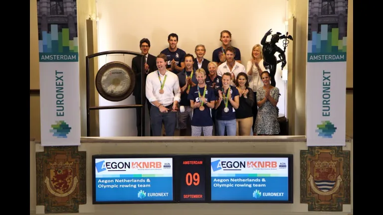 Goud, zilver en brons won de Nederlandse roeiploeg tijdens de Olympische Spelen in Rio. Olivier Siegelaar, roeier van de Holland acht én werkzaam geweest op de beursvloer en Marco Keim, CEO van Aegon Nederland, openen samen met de Olympische medaillewinnaars de beurs.