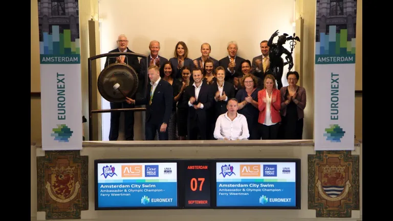 De beursgong kondigt de vijfde editie van de Amsterdam City Swim aan. Olympisch kampioen openwaterzwemmen en ambassadeur van de Amsterdam City Swim, Ferry Weertman, luidt de gong.