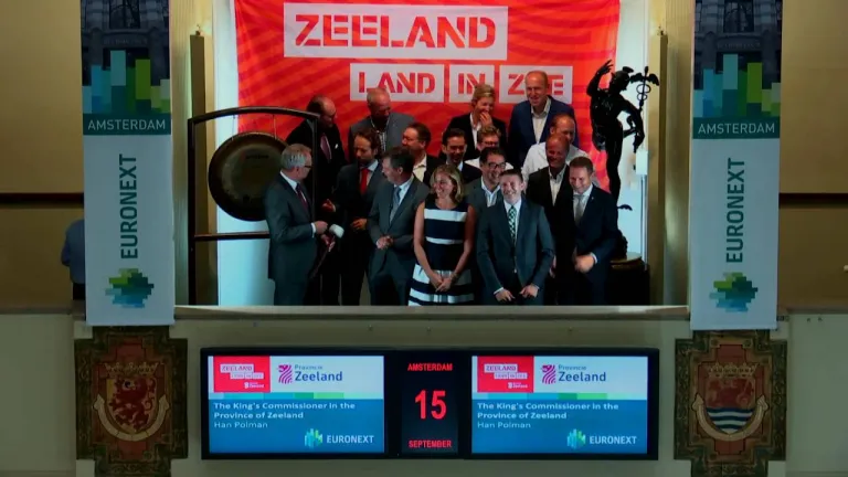 De Commissaris van de Koning in de Provincie Zeeland Han Polman opent de beurshandel door midden van de traditionele slag op de gong. Hij doet dit in aanwezigheid van Zeeuwse ondernemers en voormalig Minister-President Prof. Dr. J.P. Balkenende.