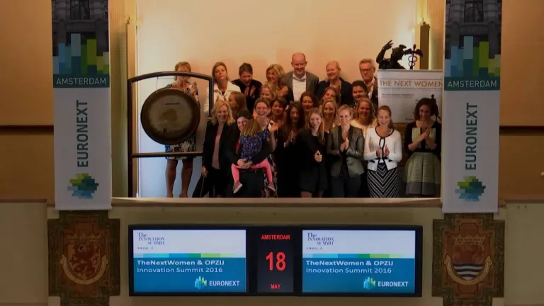 TheNextWomen en OPZIJ luiden de gong ter aankondiging van de Innovation Summit op 23 mei 2016 in Pakhuis West Amsterdam. Dit ondernemersevenement brengt vrouwelijke startende en gevestigde ondernemers, investeerders en business experts met elkaar in contact en is onderdeel van EU2016.