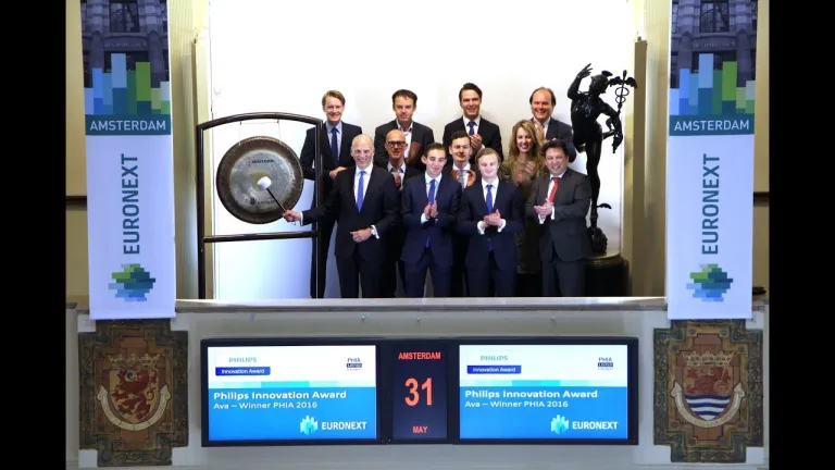 Studentenstart-up Ava, een mobiele tekstverwerker voor doven, heeft de Philips Innovation Award 2016 gewonnen. Ava mag zich komend jaar de meest innovatieve studentenstart-up van Nederland noemen en opent de handel op de Amsterdamse beurs om dit te vieren. Pieter Nota, Member Executive Committee and Board of Management, Royal Philips, luidt de gong.