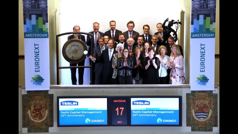 Teslin Capital Management opent met een slag op de gong de handel op de Amsterdamse beurs. Teslin bezoekt Euronext naar aanleiding van het vijfentwintigjarige jubileum van de investeerder in kleine en middelgrote beursgenoteerde ondernemingen.