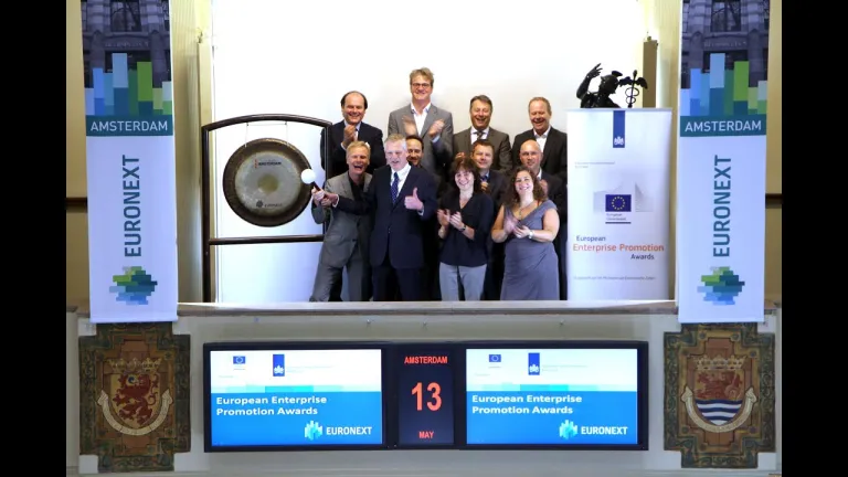 De winnaars van de Nederlandse finale van de Europese Awards voor Ondernemerschapsbevordering (EEPA) 2016 bezoeken Beursplein 5 en openen de handel met een slag op de gong.