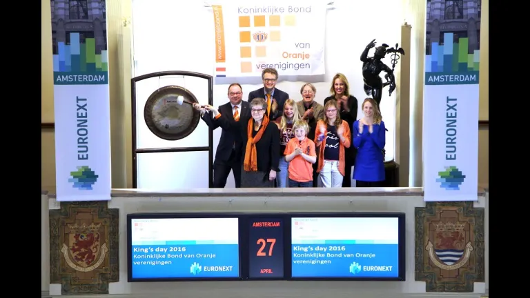 Op Koningsdag zijn talloze Oranjeverenigingen druk in de weer om een dorps- of stadsfeest te organiseren. De Koninklijke Bond van Oranjeverenigingen is de landelijke vertegenwoordiger van al deze Oranjeverenigingen. Zij bezoeken Beursplein 5 en luiden de gong.