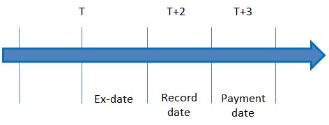The order of dates for mandatory stock distributions are aligned with the regular T+2 settlement lifecycle. The position of the ex-date for stock distributions (e.g., Bonus Issue, Stock dividend, etc.) is 1 business day before the record date as follows: