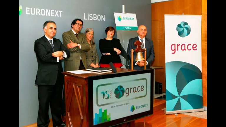 A presidente do GRACE, Paula Guimarães, juntamente com os anteriores presidentes comemorou hoje o 15º aniversário da associação sem fins lucrativos dedicada à temática da Responsabilidade Social Corporativa com o toque do sino que marcou o encerramento da sessão da Bolsa Portuguesa.