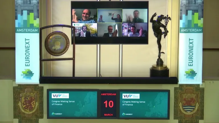 Robin van Rijn, Client Relationship Manager of Euronext, welcomed Inger Leemans, Professor Cultural History on the VU Amsterdam. Leemans sounded the gong virtually on the occasion of the 3-day Making Sense of Finance Congress.