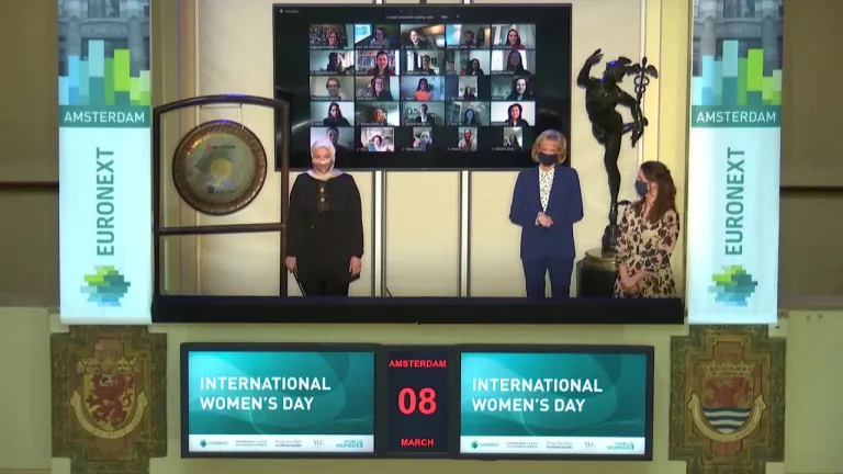 It is International Women’s Day today! Enaam Ahmed Ali, Board Member of UN Women the Netherlands, sounded the gong on this occasion. She did this together with Simone Huis in ‘t Veld, CEO of Euronext Amsterdam, and Marianne Brackel, Committee Member of Women in ETFs. The International Women’s Day 2021 theme is: “Women in leadership: Achieving an equal future in a COVID-19 world’’.